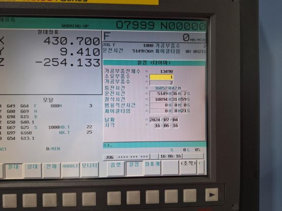 - 규격 FANUC 0i-MD, AICC1, BT40, 12000RPM(벨트식), ATC 30EA, 스핀들오일쿨러, 칩컨베이어(우측방)/칩통