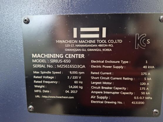 화천 6.5호 머시닝센터 SIRIUS-650 중고머시닝센타