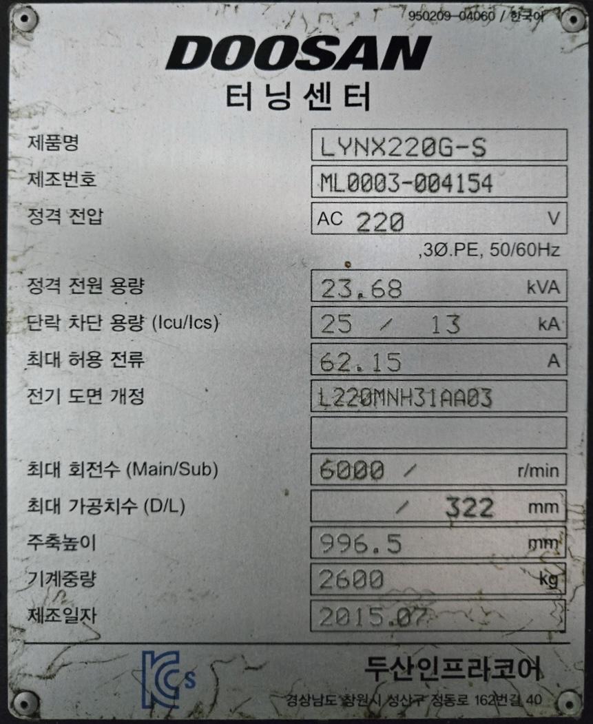 두산 6인치 갱타입 CNC선반 LYNX220G (2015년식)