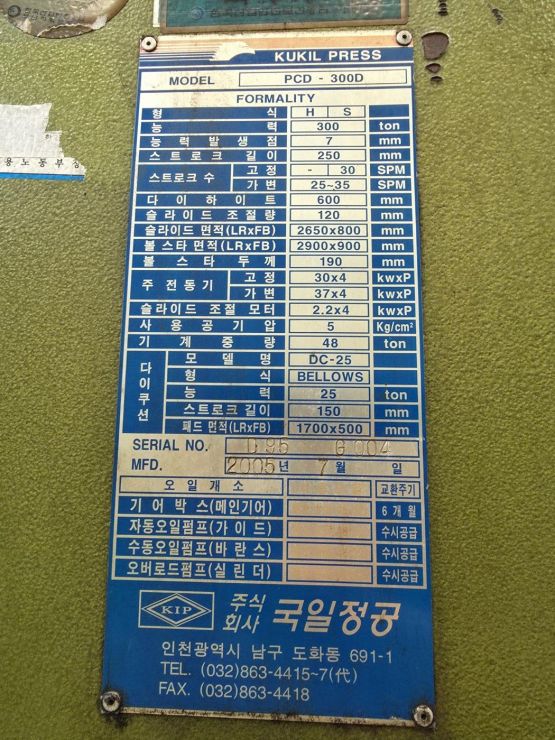 국일 C형 더블프레스 300톤-다이쿠션 有 (2005년 7월)