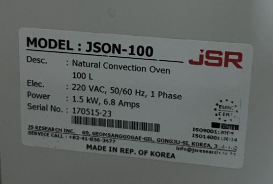 제품명: 자연대류식 건조기(JSR) 모델명: JSON-100 규격: http://www.jsresearch.co.kr/download/spec/K-JSON-100-2020.pdf