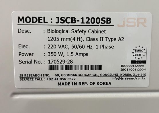 제품명: Biological Safety Cabinet 브랜드: JSR 모델명: JSCB-1200SB