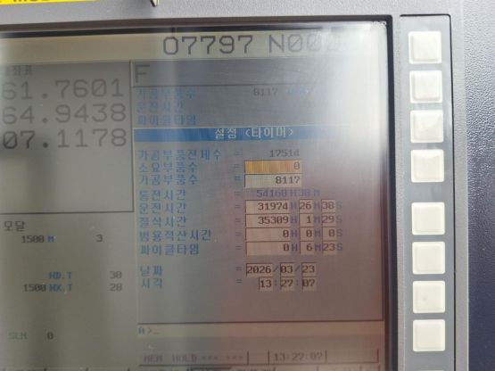 - 규격 FANUC 31i-MB, HAI600, 데이터서버, 에어블로우, 오토파워오프, BT40, 20000RPM, ATC 30EA, 공구길이측정장치(레니쇼우), 스핀들오일쿨러, 칩컨베이어