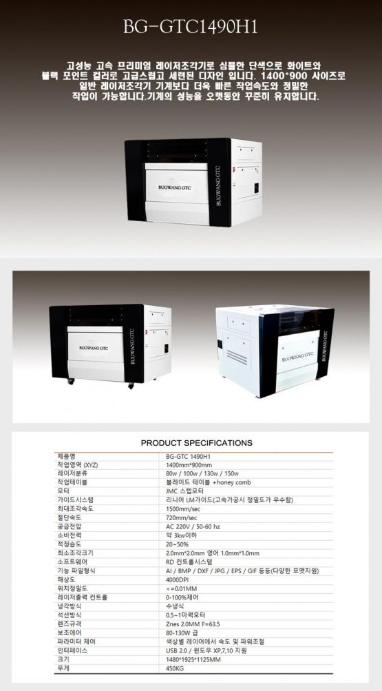 - 규격 작업영역 1400x900, 조각속도 1500mm/sec, 절단속도 720mm/sec, 설치면적 1480x1925x1125mm