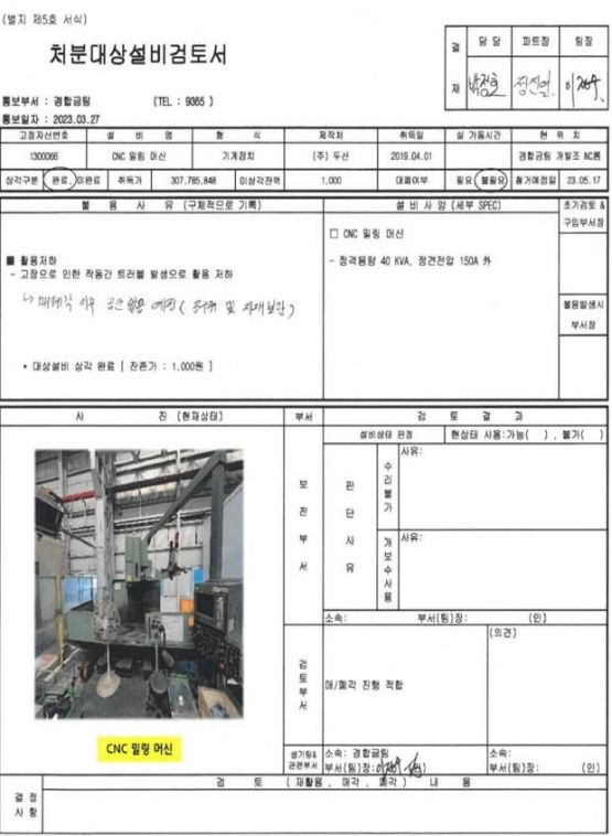 2. 해당장비의 처분대상설비검토서는 현대자동차 그룹 VAATZ 유휴자산 관리 경매공고에서 확인 가능