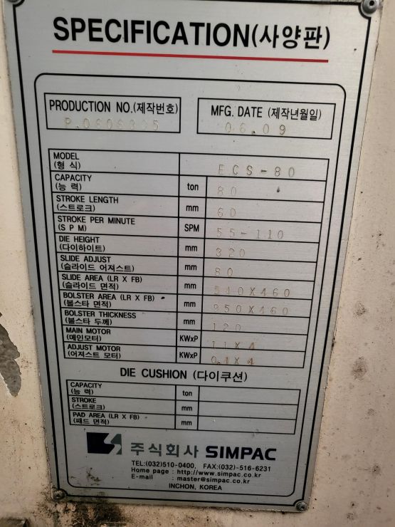 "(주) 세광기계 " 심팩 ECS-80 프레스 판매 합니다.