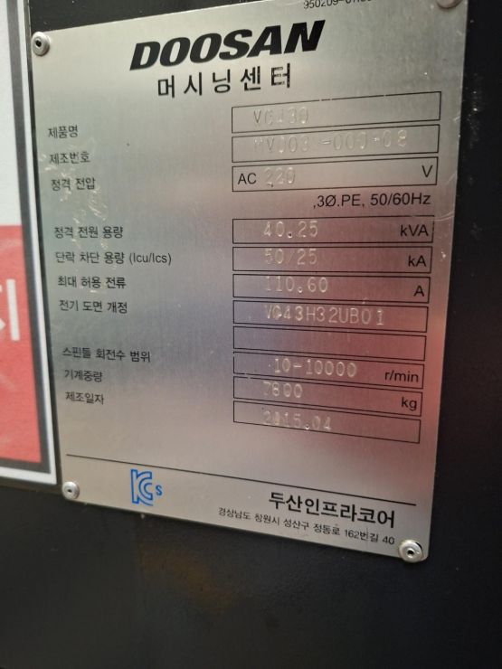 두산 4호 투파렛 머시닝센터 VC430 중고머시닝센타