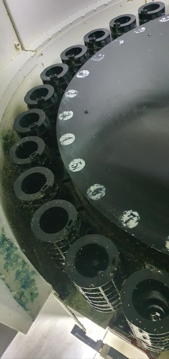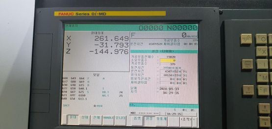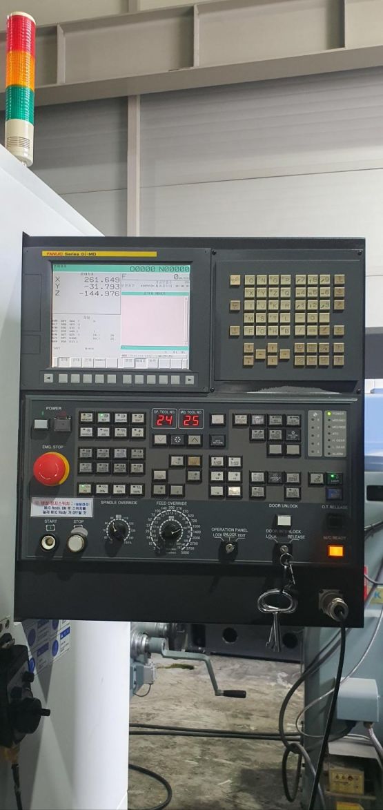- 규격 FANUC 0i-MD, AICC2, 데이터서버, 에어블로우, 오토파워오프 BT40, 10000RPM, ATC 30EA, 스핀들오일쿨러, 집진기, 칩컨베이어/칩통