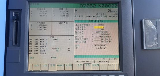 - 규격 FANUC 0i-MD, AICC1, 에어블로우, 오토파워오프 BT40, 12000RPM(직결식), ATC 30EA, 스핀들오일쿨러, 칩컨베이어/칩통