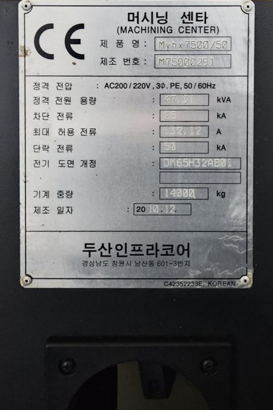 두산 7.5호 머시닝센터 MYNX7500/50 (2010년식)