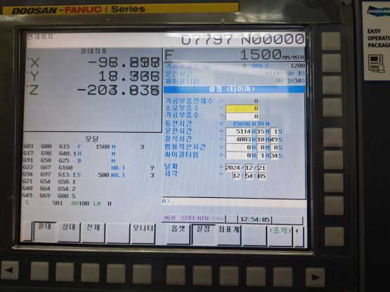 - 규격 FANUC 0i-MF, AICC1, 에어블로우. 오토파워오프, BT40, 12000RPM, ATC 30EA, 스핀들오일쿨러, 칩컨베이어/칩통