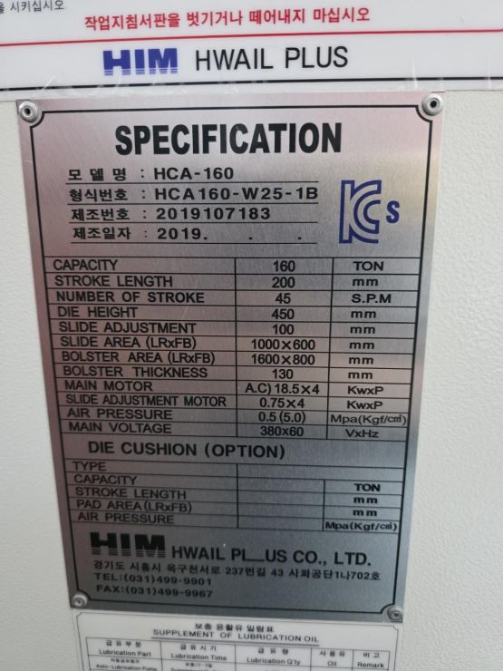화일프레스 C형 싱글 160톤 (2019년 10월)