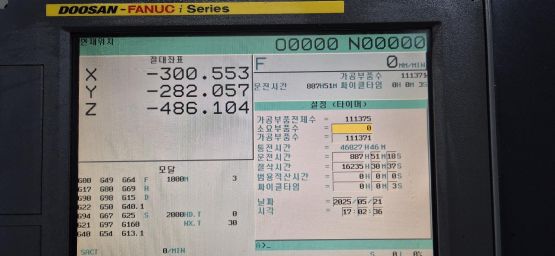 - 규격 FANUC 0i-MD, AICC2, 에어블로우, 오토파워오프 BT40, 8000RPM(벨트식), ATC 30EA, 스핀들오일쿨러, 칩컨베이어/칩통