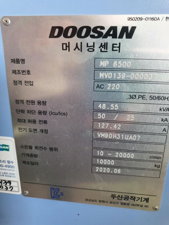 중고 두산 MP-6500 머시닝센터 20K 2020년식 풀옵션