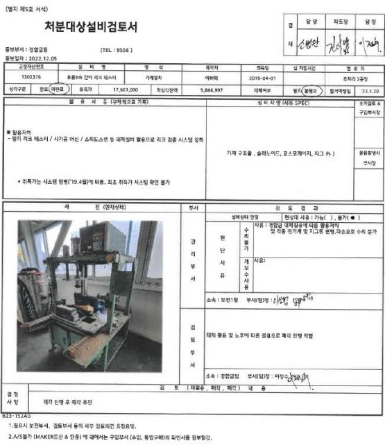 2. 해당장비의 처분대상설비검토서는 현대자동차 그룹 VAATZ 유휴자산 관리 경매공고에서 확인 가능